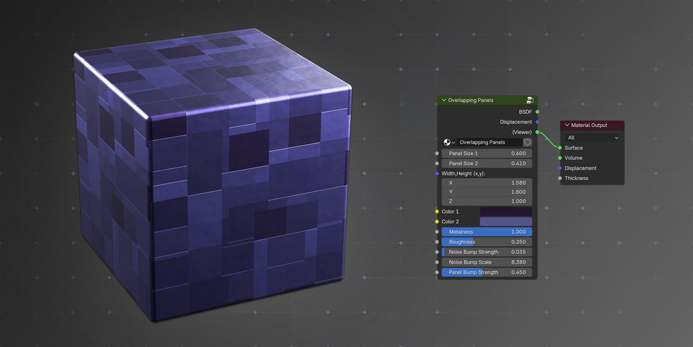 - Renders of materials and their respective node groups